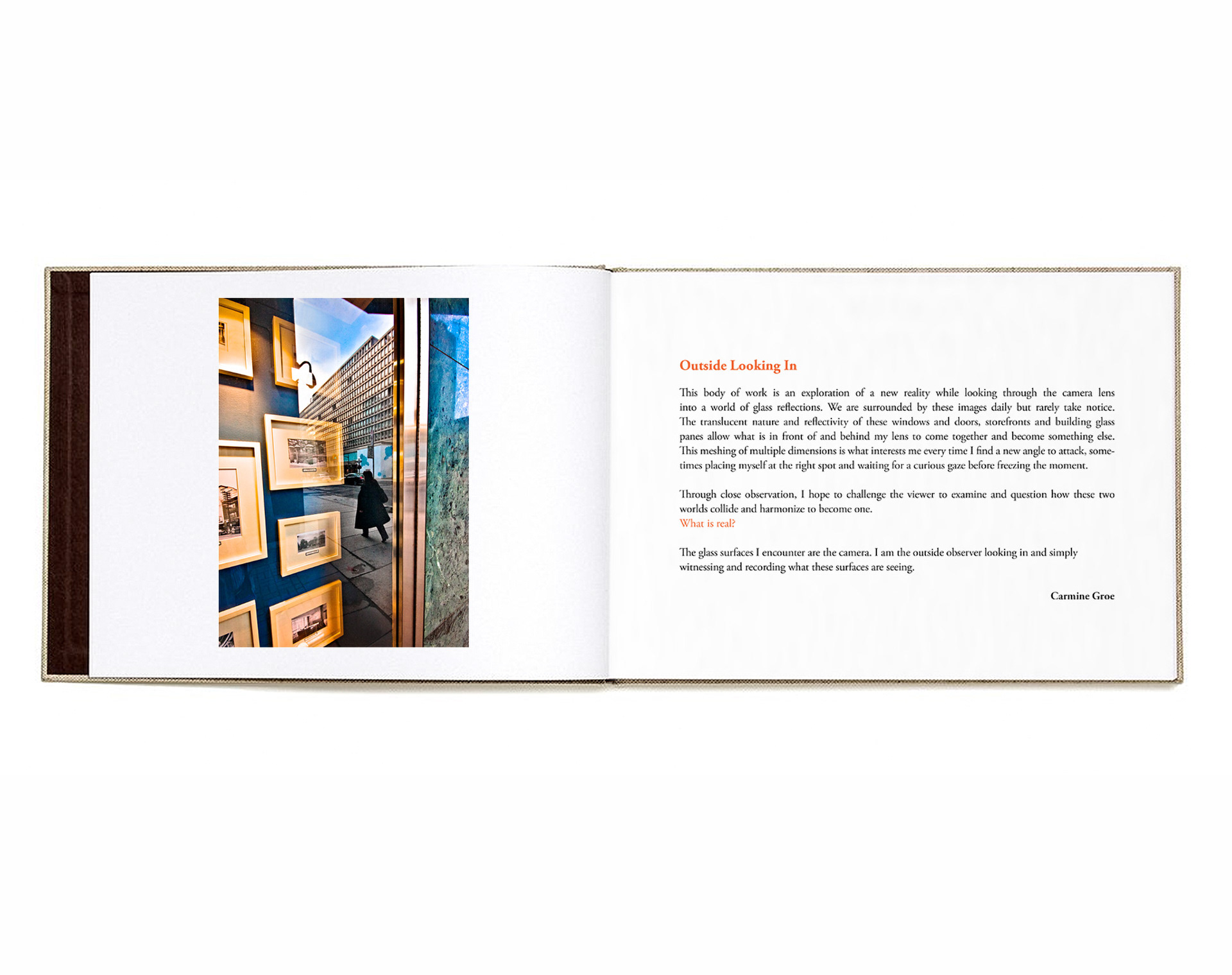 This body of work is an exploration of a new reality while looking through the camera lens into a world of glass reflections. We are surrounded by these images daily but rarely take notice. The translucent nature and reflectivity of these windows and doors, storefronts and building glass panes allow what is in front of and behind my lens to come together and become something else. This meshing of multiple dimensions is what interests me every time I find a new angle to attack, sometimes placing myself at the right spot and waiting for a curious gaze before freezing the moment.